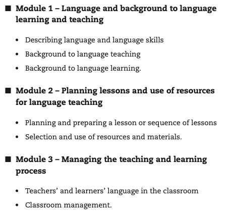 经过比较发现,TKT的前三个模块的教材内容与American TESOL certificate的认证教学内容有近乎90%的内容是相通的,在American TESOL certificate的教学知识点考试中和TKT的考试中有很多内容接近,所以学了TESOL的伙伴可以直接考虑拿下TKT的前三个模块。大家可以参考international TESOL certificate的教学大纲